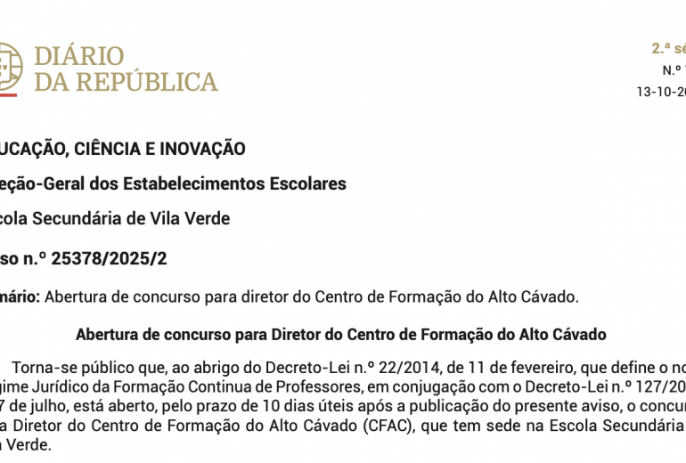 Abertura de Concurso para Diretor do Centro de Formação do Alto Cávado (CFAC)